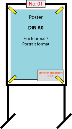 Für die Anbringung der Poster wird entsprechendes Befestigungsmaterial zur Verfügung gestellt. Die vortragenden Autoren sollten mindestens die Hälfte der Zeit ihrer Session für Diskussionen bei ihrem Poster zu finden sein. Tragen Sie bitte die entsprechende Zeit auf Ihrem Poster ein.